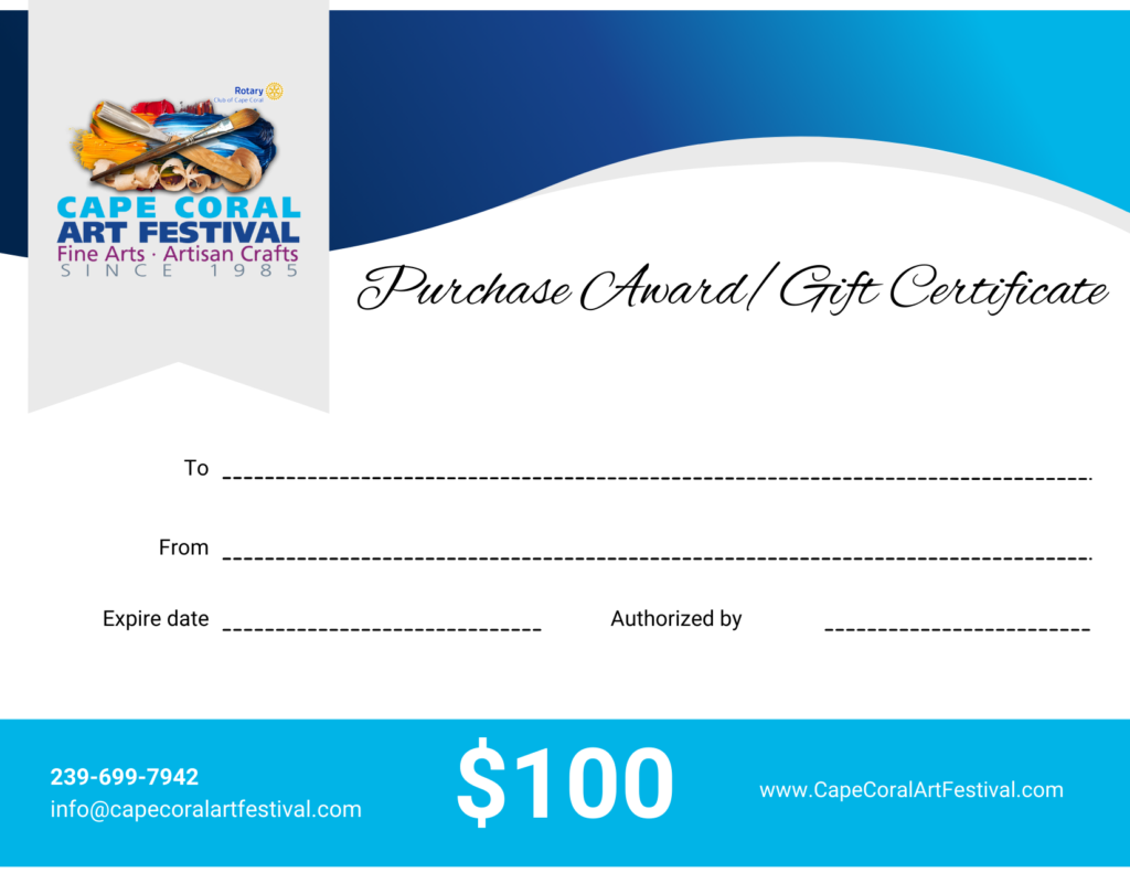 Gift Certificates are more than a sale—they’re a celebration of artistic excellence and community spirit. By participating, you help ensure the Cape Coral Art Festival remains one of the premier cultural events in Southwest Florida, drawing over 140,000 visitors each year and supporting the Rotary Club’s many charitable initiatives. To learn more about the Gift Certificates, click here.